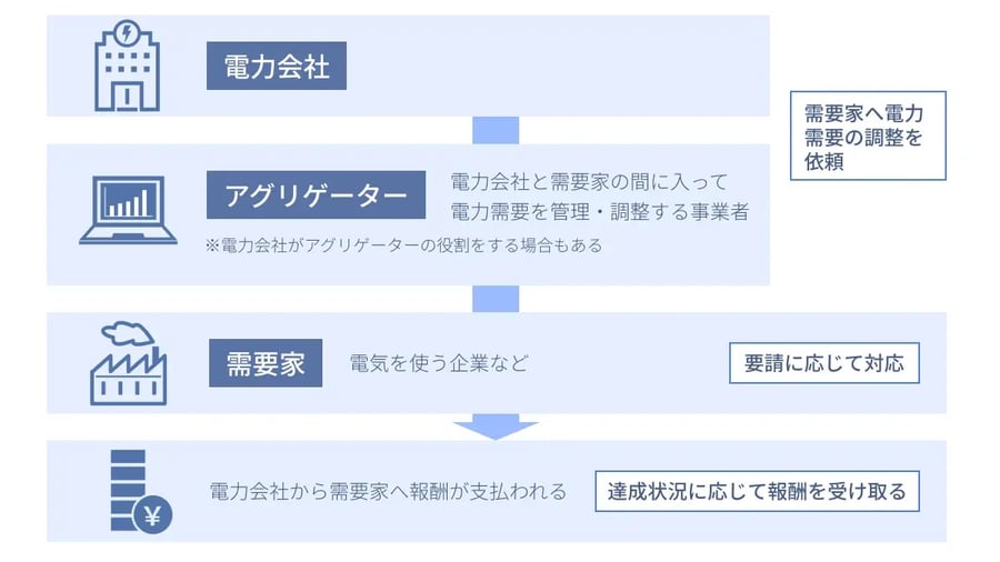 契約しているアグリゲーターや電力会社からの要請に応じて、電力がひっ迫する時間帯には節電を行い、逆に余剰電力がある時間帯には消費を増やす対応を行います。その達成状況に応じて、需要家は報酬を受け取ることができます。
