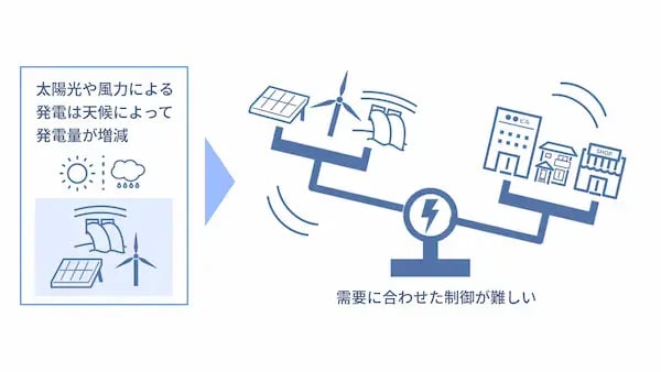 また、近年は、地球温暖化防止を目的に、太陽光発電や風力発電といった再生可能エネルギー導入が進んでいます。しかし、これらの再生可能エネルギーは天候によって発電量が増減する性質を持ち、火力発電のような従来の方法のように需要に合わせて自在に制御できません。