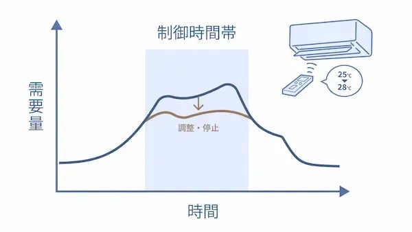 空調や照明などの設備の運転を調整・停止することで、電力需要を抑制する <例> ・冷房の設定温度を上げる ・冷房の運転をオフにする ・部分的に照明をオフにする |