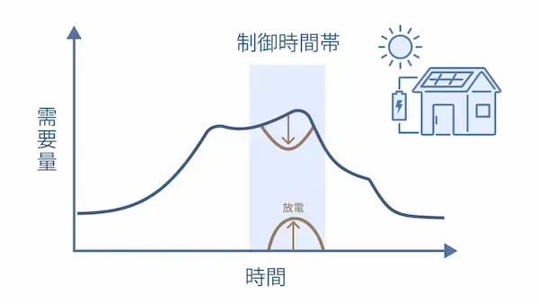 蓄電池に貯めておいた電気を使い、電力会社からの電力供給を減らすことで、需要を減らす |