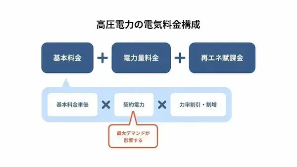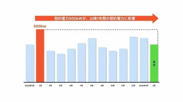つまり、一度でも最大デマンド値を更新すると、以降1年間の電気料金に影響するのです(高圧小口電力契約50~500kW未満の場合)。