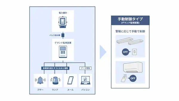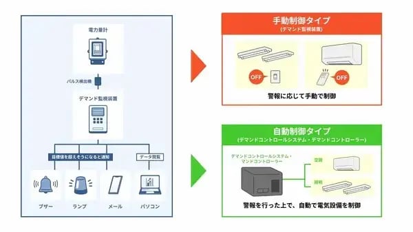 大きな違いは、デマンドコントロールシステムは警報を行ったうえで設備を「自動で制御する」という点です。